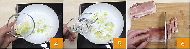 añade el puerro y déjalo pochar con un poco de agua, a fuego lento durante 5 minutos (4-5). Ahora corta a juliana el speck 6