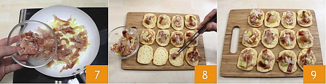 y añádelo al puerro 7. Mezcla todo con una cuchara de madera para amalgamar bien los sabores, luego continúa la cocción a fuego moderado durante 6-7 minutos. Pasado este tiempo, toma las tortitas y, con la ayuda de unas pinzas de cocina, coloca sobre cada una un poco de la mezcla de speck y puerro 8. Las tortitas con juliana de puerro y speck están listas 9, ¡recomendamos servirlas y disfrutarlas al momento!