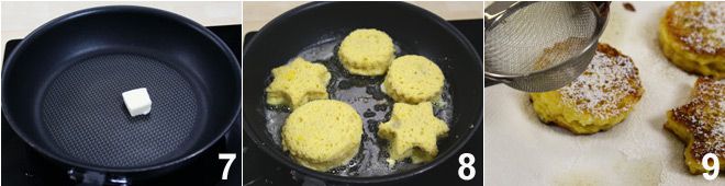 Derrite la mantequilla en una sartén antiadherente 7, coloca las formas 8 y cocínalas por ambos lados hasta que estén bien doradas. Luego, colócalas sobre una hoja cubierta con papel absorbente, espolvoréalas con azúcar glas y cúbrelas con algunos fideos de colores... ¡sírvelas bien calientes!