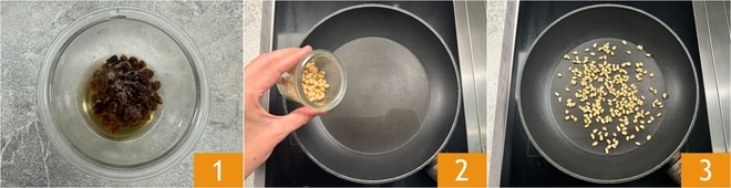 Para preparar el strudel de manzana con hojaldre, primero pon las pasas a remojar en un poco de agua. Mientras tanto, coloca los piñones en una sartén antiadherente 2 y tuéstalos durante unos 3 minutos, o hasta que se doren, teniendo cuidado de no quemarlos 3.
