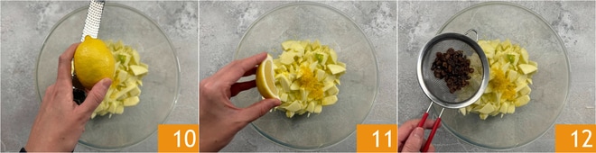 Transfiere las manzanas cortadas a un bol, luego añade la cáscara de limón rallada 10, el jugo de un gajo 11 y las pasas escurridas 12.