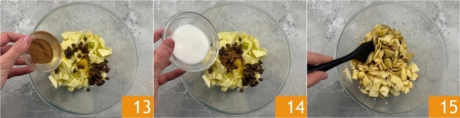 Agrega también la canela 13, el azúcar 14 y los piñones tostados. Mezcla bien para integrar todo 15.