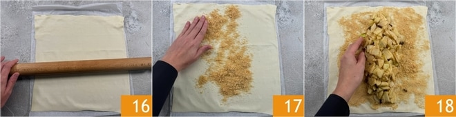 Estás listo para ensamblar el strudel: saca el hojaldre del frigorífico y colócalo sobre la superficie de trabajo con su papel de horno, manteniendo el lado largo hacia ti, luego extiéndelo delicadamente con el rodillo hasta casi formar un cuadrado 16. Espolvorea la superficie con pan rallado, teniendo cuidado de dejar libre un espacio alrededor de los bordes 17, luego coloca las manzanas en el centro ayudándote con las manos o con una espátula para formar una especie de rollo 18.