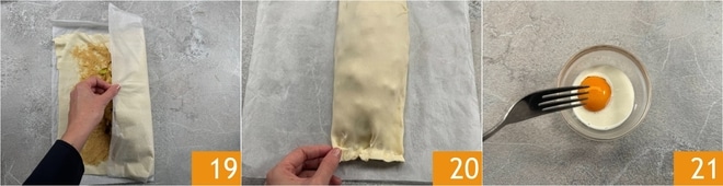 En este punto, levanta los bordes del papel de horno para cubrir el relleno con el hojaldre, primero de un lado 19 y luego del otro. Estira ligeramente el hojaldre para que se superponga exactamente al primer borde, luego presiona suavemente el cierre para que se adhiera. Finalmente, sella los extremos 20 y enróllalos para formar un cordón. En un bol pequeño mezcla la yema con la nata 21.