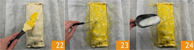 Pincela el strudel con la mezcla obtenida 22, luego haz cortes en la superficie, teniendo cuidado de no presionar demasiado, como si quieras cortar solo la primera capa de hojaldre 23. Por último, espolvorea con azúcar granulada 24. Cocina el strudel en el horno precalentado a 180° durante unos 40 minutos, monitoreando la cocción: si se oscurece demasiado de un lado o en la superficie, puedes girarlo o moverlo a un estante más bajo durante los últimos 10-15 minutos.
