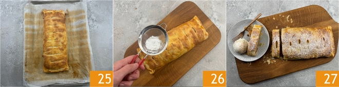 Una vez cocido, sácalo del horno 25 y espolvorea con azúcar glas 26. ¡Tu strudel de manzana con hojaldre está listo para ser disfrutado caliente, tibio o a temperatura ambiente 27!