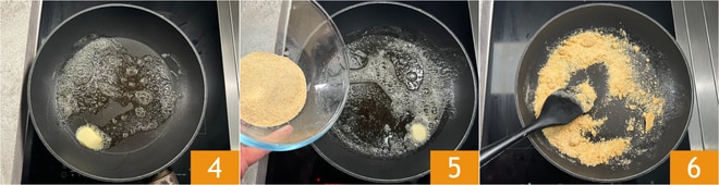 Aparte los piñones y derrite una nuez de mantequilla en la misma sartén 4, luego agrega el pan rallado 5 y tuéstalo durante unos 3 minutos, revolviendo a menudo 6. Cuando haya tomado color de manera uniforme, apaga el fuego y reserva.