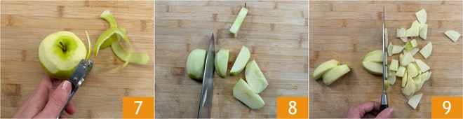 Pasa a las manzanas: pélalas 7 y córtalas en gajos 8, luego corta los gajos en rodajas finas del lado más corto para obtener triangulitos 9.