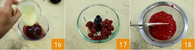 Verted 40 g de leche condensada en la salsa 16 y mezclad para amalgamar el compuesto. Proceded del mismo modo con las frambuesas: trituradlas en la batidora 17, pasad el compuesto por el tamiz 18