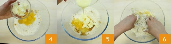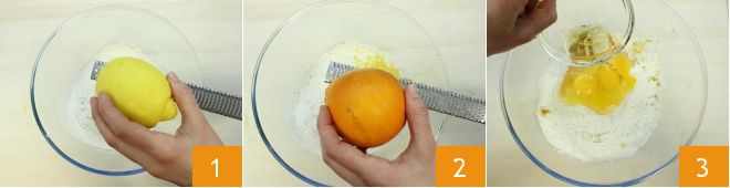 Para realizar los strufoli con cremas comenzad con la masa: poned la harina tamizada en un bol, rallad la corteza del limón 1 y de la naranja 2, luego añadid al centro los huevos 3,