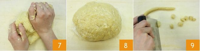 Amasad enérgicamente (6-7) y, una vez obtenido un compuesto homogéneo y bastante compacto, dadle forma de bola y cubridlo con film transparente 8, dejadlo reposar durante al menos media hora. Pasado el tiempo de reposo, trabajad la masa un poco más y divididla en tantos bastoncillos de un grosor menor que un dedo, rodándolos sobre una superficie ligeramente enharinada. En este punto, cortad los bastoncillos en pequeños trozos 9 y disponedlos sobre un paño, teniendo cuidado de no superponerlos.