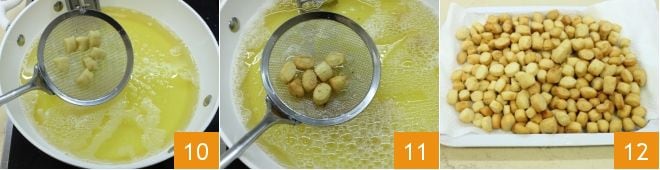 Una vez listos, poned el aceite en una sartén y freíd vuestros strufoli poco a poco 10 para una cocción óptima el aceite debe tener una temperatura de aproximadamente 170°-180°. Cuando los strufoli estén inflados y dorados 11 pero no particularmente coloreados para evitar que se quemen, escurridlos y dejadlos enfriar sobre papel absorbente de cocina 12.