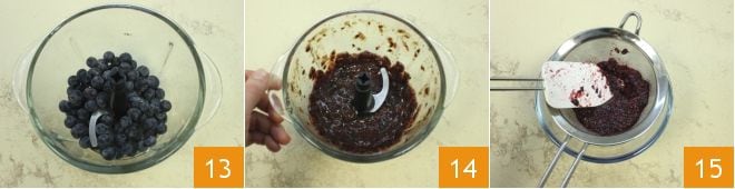 Ahora ocupáos de las cremas: poned los arándanos en el vaso de la batidora 13 y trituradlos 14, pasad el compuesto obtenido por un tamiz para obtener una salsa lisa 15.
