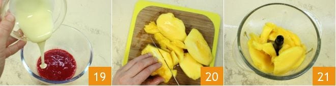 y luego incorporad 40 g de leche condensada 19. Por último, preparad la crema de mango: cortad el fruto en gajos 20, trituradlo en la batidora 21