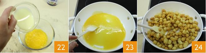 y agregad también aquí 40 g de leche condensada 22. Ahora preparad el caramelo para cubrir los strufoli: calentad en la sartén a fuego lento la miel hasta obtener una salsa lisa 23,