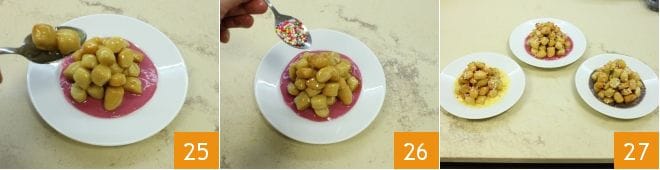 verted los strufoli y mezclad para amalgamar el jarabe 24. En este punto podéis componer el plato: verted las 3 salsas en 3 platos distintos, colocad encima los strufoli 25 y para terminar decorad la superficie con azucarillos de colores 26. ¡Vuestros strufoli con cremas de leche están listos para ser degustados!