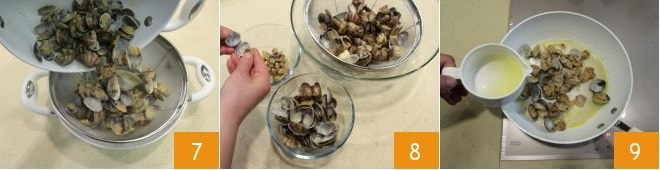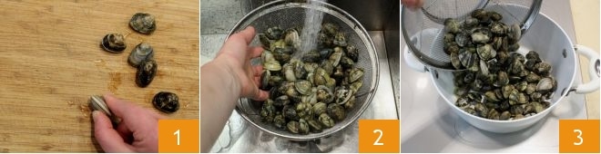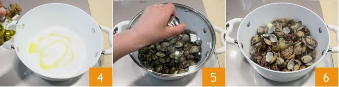 y un diente de ajo pelado y sofríelo por un instante. Escurre bien las almejas y viértelas en la cacerola 4, cubre con la tapa 5 y enciende el fuego fuerte: de esta manera las valvas se abrirán con el calor. Debes apagar el fuego inmediatamente después de la completa apertura 6, para no comprometer la ternura del marisco con una cocción demasiado prolongada.