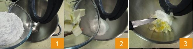 Para preparar la tarta a capas, lo primero que debes hacer es realizar la masa quebrada. Vierte en el bol de una batidora, equipada con una pala, el azúcar glas 1, la mantequilla 2, la ralladura de limón y las semillas que habrás retirado de la vaina de vainilla 3.Trabaja la mezcla y cuando los ingredientes estén bien integrados