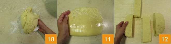 Luego transfiere la masa a una superficie 10 y forma un bloque, que debes envolver en film 11 y dejar reposar en el frigorífico durante una hora. Pasado este tiempo, divide el bloque en 4 partes iguales 12.