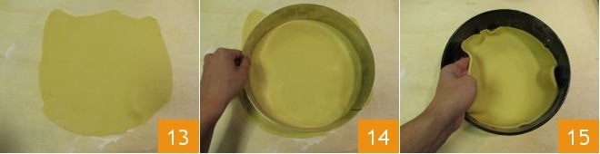 Espolvorea una superficie con un poco de harina y extiende una porción de masa hasta obtener un grosor de 5 mm 13. Si la temperatura de la habitación es muy alta, conserva el resto de la masa en el frigorífico. Utilizando un aro de 26 cm, corta el primer disco de masa 14 y transfiérelo a un molde desmontable de 22 cm. Siendo el disco más grande que el molde, se creará naturalmente un borde 15 que contendrá la mermelada.