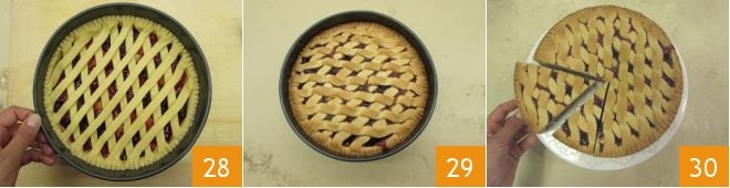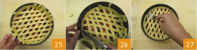 De este modo, crearás los clásicos rombos 25. Con un cuchillo pequeño, elimina el exceso de masa de los bordes 26. Utilizando los dientes de un tenedor, decora los bordes de la tarta a capas, presionando la masa delicadamente hacia abajo 27.