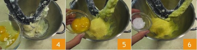 añade primero los huevos enteros 4, déjalos absorber y luego añade también las yemas 5. Trabaja un poco más, luego añade la sal 6