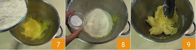 la harina 7 y la levadura 8. Enciende la batidora y trabaja el tiempo necesario para obtener una mezcla uniforme 9.