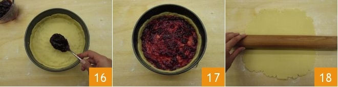 Coloca 1/3 de la cantidad de mermelada en el interior 16 y espárcela por toda la superficie de la tarta 17. Luego toma otro bloque de masa y, como acabas de hacer, extiéndelo a un grosor de medio cm 18 y corta otro disco de 26 cm que debes colocar sobre la mermelada, haciendo que el borde se adhiera bien al molde.