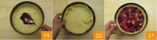 Recubre con la mitad de la mermelada restante 19. Luego corta un último disco de masa de 26 cm de medio cm de grosor y colócalo encima como hasta ahora, haciendo que los bordes se adhieran bien al molde 20. Vierte la mermelada restante y espárcela por toda la tarta 21.