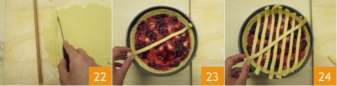 Luego toma el último bloque de masa, extiéndelo a un grosor de medio cm y corta tiras de 1 cm de ancho y más largas que el diámetro de la tarta 22. Coloca la primera fila de tiras 23, disponiéndolas de manera paralela y espaciadas entre sí. Luego gira el molde y realiza una segunda fila de tiras, girándolas respecto a las de abajo 24.
