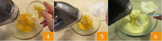 Continúa rompiendo los huevos a temperatura ambiente en un bol, acciona las varillas (alternativamente también servirá una batidora con varillas) y añade la ralladura de un limón 4, luego vierte el azúcar poco a poco: de esta manera favorecerás el aumento de volumen. Sigue montando los huevos hasta obtener una mezcla clara y espumosa, tardará unos 4-5 minutos 5. Después añade la nata agria, siempre a temperatura ambiente, poco a poco, para que la mezcla no pierda volumen 6.