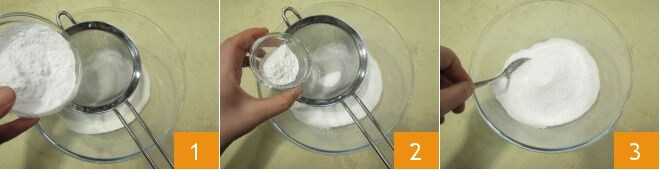Para preparar la tarta con harina de arroz, comienza tamizando los polvos a través de un colador de malla fina. Vierte entonces la harina de arroz, la fécula de patata 1 y la levadura para dulces 2. Una vez que hayas eliminado los grumos, mezcla con delicadeza utilizando una cuchara 3; reserva el bol.
