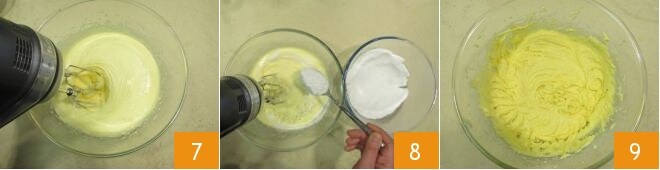 Una vez terminada la nata agria, continúa trabajando por unos minutos más, verás que la mezcla volverá a aumentar de volumen 7. Ha llegado el momento de añadir los polvos, una cucharada a la vez, mientras el batidor sigue en funcionamiento 8: añade la cantidad siguiente solo cuando la anterior haya sido completamente absorbida 9.