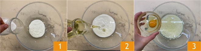 Para preparar la tarta de coco rellena, lo primero que debes hacer es verter en un bol el yogur de coco, la leche 1, el aceite de semillas 2 y el huevo 3.