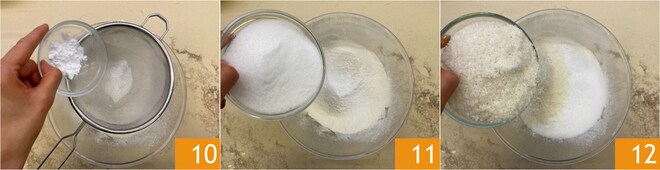 Tamiza también el bicarbonato 10, luego añade el azúcar 11 y el coco rallado 12.