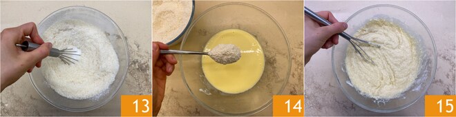 Mezcla bien 13, luego incorpora los ingredientes secos a los líquidos 14. Amalgama todo con una batidora de mano hasta obtener una masa lisa y homogénea 15.