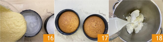 Unta con mantequilla dos moldes desmontables de 20 cm de diámetro, coloca un disco de papel de horno en el fondo y enharina los bordes. Vierte la masa en los moldes dividiéndola en partes iguales 16. Coloca ambos moldes en la rejilla baja del horno y hornea en horno estático precalentado a 175°C durante 35 minutos 17. Durante los últimos minutos, controla la cocción con la prueba del palillo. Esta receta no prevé el almíbar, por lo que es importante que las tartas no se cocinen más de lo debido para mantener una masa bastante húmeda. Una vez cocidas, sácalas del horno y déjalas enfriar completamente. Mientras tanto, prepara el frosting: en una batidora coloca el mascarpone y el queso crema, luego vierte la nata fresca 18.
