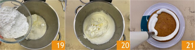 Añade el azúcar glas 19 y bate con la batidora hasta obtener una crema bastante compacta 20. Puedes seguir el mismo procedimiento usando un bol y una batidora eléctrica. Transfiere la crema a una manga pastelera con boquilla lisa de 10-12 mm de diámetro. Una vez que las tartas se hayan enfriado, desmóldalas y, si es necesario, corta la cúpula para poder colocarlas sin problemas en un plato. Añade en la superficie una capa de crema de aproximadamente 1,5-2 cm de grosor 21.