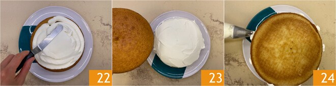 Nivela la crema 22, luego coloca encima la segunda tarta con la cúpula hacia abajo 23. Distribuye el frosting en el borde creando líneas verticales 24.