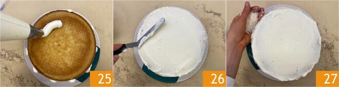 Añade la crema también en la superficie 25, luego con la ayuda de una espátula distribúyela uniformemente para cubrir completamente la tarta 26. En este punto, adhiere el coco rallado en los bordes de la tarta 27.