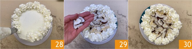 Exprime pequeños montones de crema a lo largo del borde de la superficie usando una boquilla estriada 28. Finalmente, decora el centro con copos de coco deshidratado 29. Deja reposar la tarta en el frigorífico durante al menos 2-3 horas antes de servir. Tu tarta de coco rellena está lista para ser disfrutada 30!