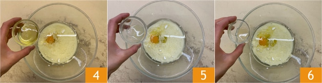 Agrega la clara de huevo 4, el zumo de limón 5 y el vinagre de vino blanco 6.