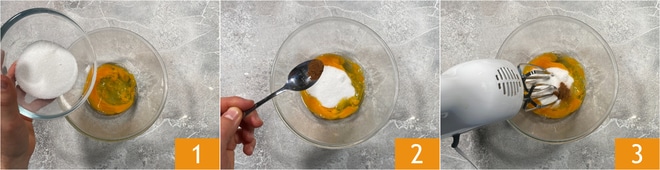 Para preparar la tarta de manzana en sartén, comienza vertiendo en un bol los huevos con el azúcar 1 y la canela 2. Enciende las batidoras y bate durante 10 minutos 3.