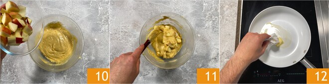 Vierte los trozos de manzana en el bol con la masa 10 y mezcla 11. Engrasa una sartén, con un diámetro de 24 cm en la superficie y 20 cm en la base, y deja derretir la mantequilla extendiéndola con una servilleta 12.