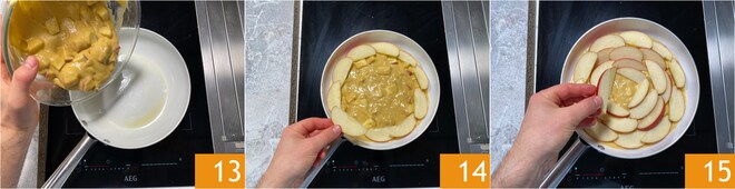 Cuando el fondo esté bien caliente, vierte la masa de la tarta de manzana 13. Coloca las rodajas de manzana en forma de espiral: comienza desde el exterior 14 y llega al centro 15.
