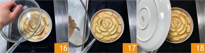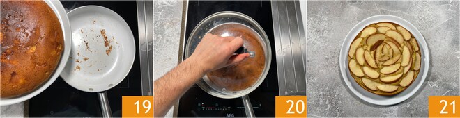 Voltea la tarta y vuelve a colocarla delicadamente en la sartén 19 para dorar otros 5-10 minutos a fuego bajo y con la tapa 20. Cuando la tarta de manzana en sartén esté fría, espolvorea al gusto con azúcar glas y sirve 21.