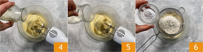 Cuando la mezcla esté bien espumosa, añade en hilo primero el aceite 4 y luego la leche 5. Apaga las batidoras y tamiza directamente en el bol la harina y la levadura para dulces 6.
