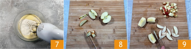 Enciende las batidoras un instante para mezclar 7 y reserva un momento. Corta media manzana en cubos de 1,5-2 cm 8, y con el resto saca gajos de aproximadamente 3-4 mm 9.
