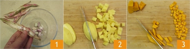 Para realizar la tarta de pan y verduras, primero preparad los ingredientes: desgranar los frijoles frescos 1, luego pelad las patatas y cortadlas en cubitos 2. Limpia la calabaza y córtala también en cubitos 3. Necesitarás unos 150 g de frijoles desgranados y 160 g de pulpa de calabaza.