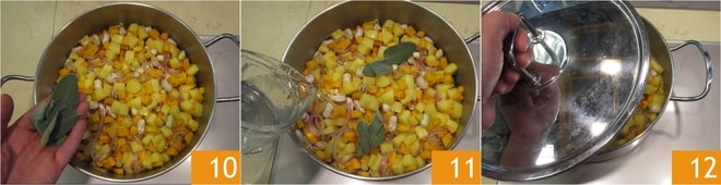 Añade las hojas de salvia para dar aroma 10, sala, echa pimienta y vierte el agua caliente 11. Cocina con la tapa durante unos 20 minutos a fuego medio-bajo, removiendo de vez en cuando 12.